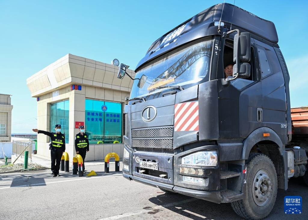 2024年4月18日12時(shí)許,在霍爾果斯公路口岸,一輛來(lái)自哈薩克斯坦的貨車通過(guò)查驗(yàn)站。新華社記者 陳朔 攝