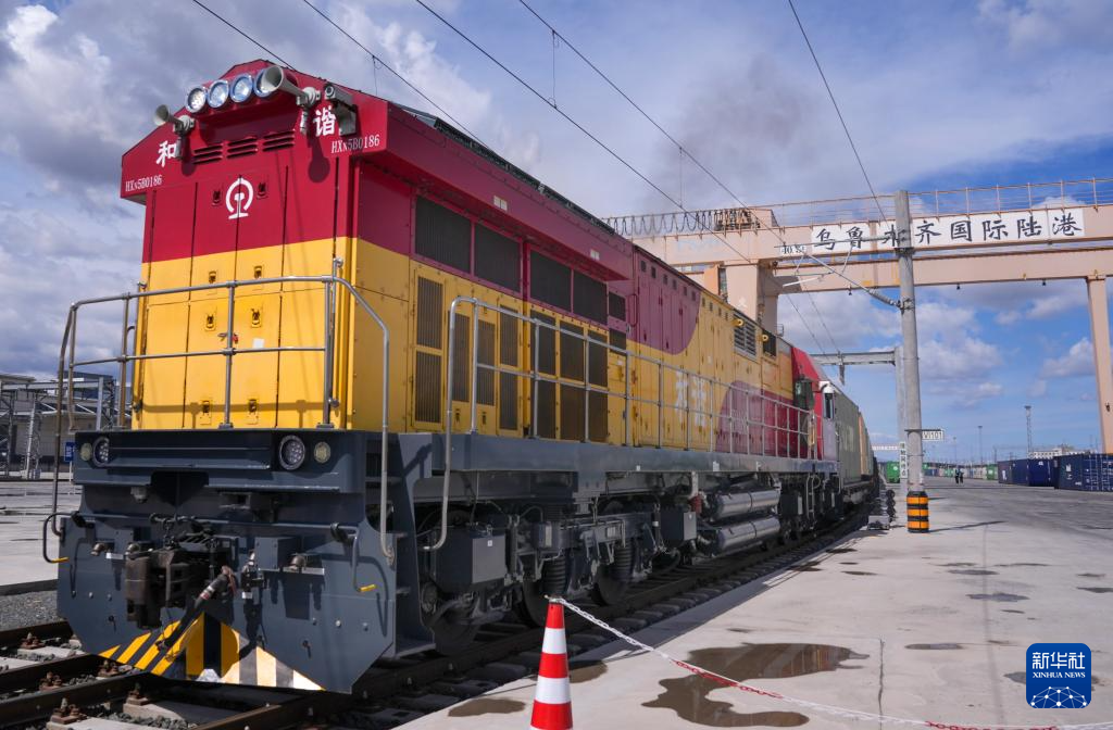 2024年5月27日,一列滿載貨物的中歐班列駛離新疆烏魯木齊國(guó)際陸港區(qū)。新華社記者 王菲 攝