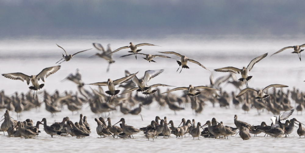 在江西省南昌市,一群黑尾塍鷸在鄱陽湖畔的五星白鶴保護(hù)小區(qū)上空飛翔(2023年3月10日攝)。新華社記者 周密 攝