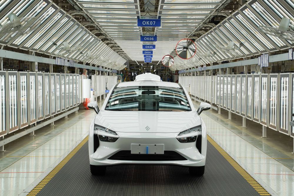 在位于江西省南昌市經(jīng)開區(qū)的江鈴集團(tuán)新能源汽車有限公司生產(chǎn)基地拍攝的汽車生產(chǎn)流水線(2023年7月18日攝)。新華社記者 周密 攝