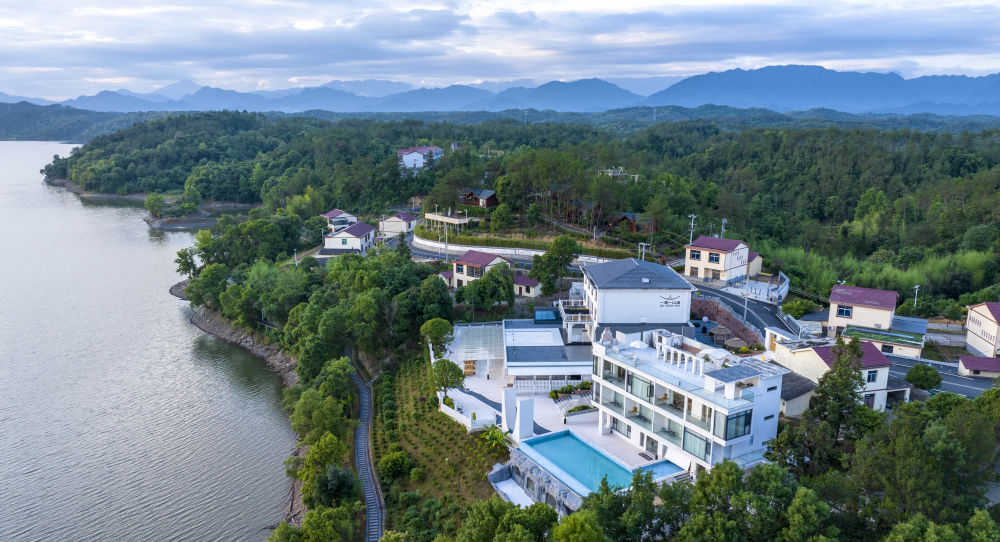 這是江西省武寧縣修河畔“一渡一山?!泵袼奕?,一些返鄉(xiāng)農(nóng)民在這里受聘為民宿管家(2024年6月3日攝,無人機(jī)照片)。新華社發(fā)(梁振堂 攝)