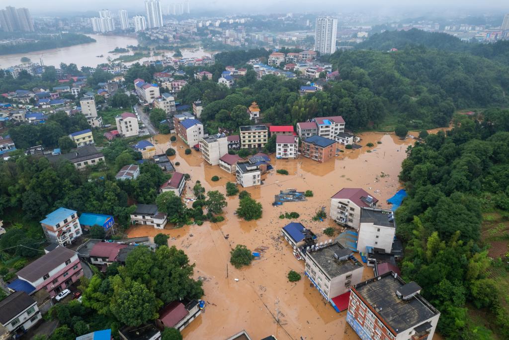 這是7月1日在平江縣天岳街道大西村拍攝的被淹現(xiàn)場(無人機照片)。新華社記者 陳思汗 攝