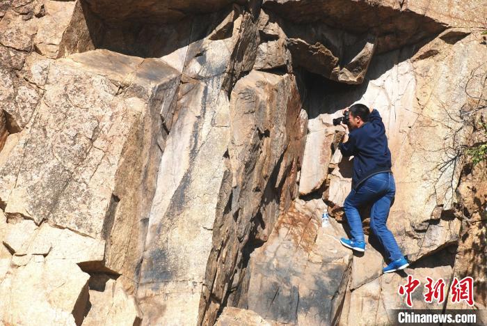 資料圖。圖為2018年,包金泉在科右中旗杜爾基鎮(zhèn)衙門(mén)毛杜嘎查境內(nèi),采集畢其格哈達(dá)題記內(nèi)容。 科右中旗文物考古研究所供圖