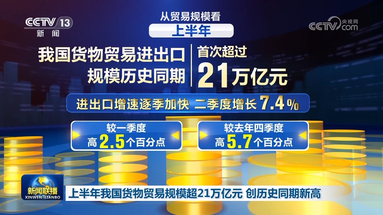 從貿易規(guī)模看,上半年,我國貨物貿易進出口規(guī)模歷史同期首次超過21萬億元。進出口增速逐季加快,二季度增長7.4%,較一季度和去年四季度分別高2.5個、5.7個百分點,貨物貿易進出口質量持續(xù)提升、規(guī)模較快增長。
