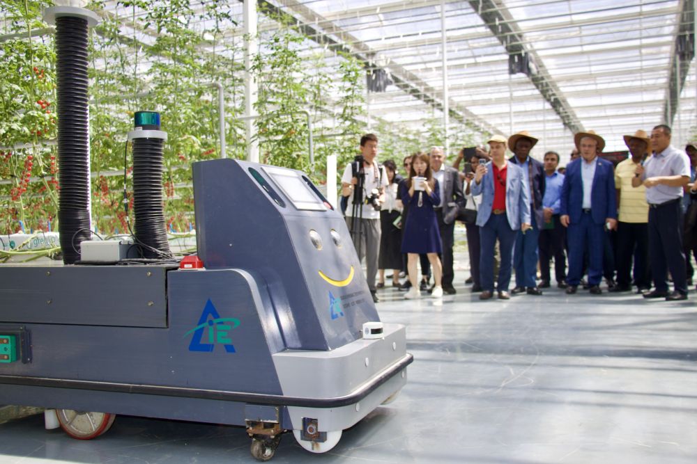 鄂爾多斯市達拉特旗德農(nóng)現(xiàn)代高效設(shè)施農(nóng)業(yè)產(chǎn)業(yè)園13000平米的大棚內(nèi),全自動機器人在無土栽培的西紅柿藤蔓間往來穿梭,高效完成巡檢、采摘、施肥等各項工作。使節(jié)們邊看邊贊嘆不已。
