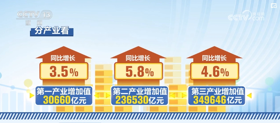 分產(chǎn)業(yè)看,第一產(chǎn)業(yè)增加值30660億元,同比增長(zhǎng)3.5%;第二產(chǎn)業(yè)增加值236530億元,增長(zhǎng)5.8%;第三產(chǎn)業(yè)增加值349646億元,增長(zhǎng)4.6%。分季度看,一季度國(guó)內(nèi)生產(chǎn)總值同比增長(zhǎng)5.3%,二季度增長(zhǎng)4.7%。從環(huán)比看,二季度國(guó)內(nèi)生產(chǎn)總值增長(zhǎng)0.7%。