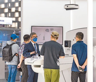 在2023世界人工智能大會上,參觀者正在了解通用電氣醫(yī)療深度天眼CT。
