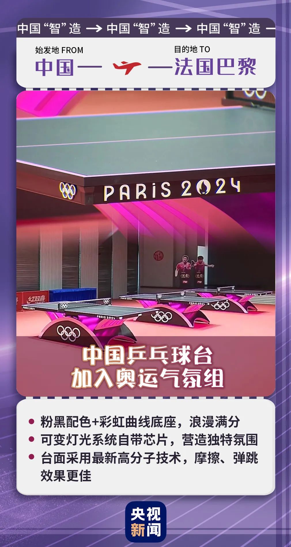 這次巴黎奧運(yùn)會(huì)的乒乓球球桌是由中國“智”造的,是粉、黑色,搭配彩色的曲線底座,期待這樣浪漫的氛圍加上浪漫的巴黎,會(huì)有怎么樣的碰撞!