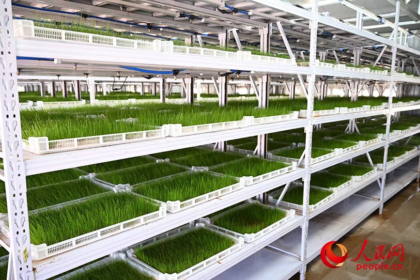 除了飼養(yǎng)蘇尼特羊的棚圈之外,牧場中還設計了一座溫室房,里面整齊排列的架子上,種植著郁郁蔥蔥的燕麥草,這里被牧民親切地稱為“空中牧場”。