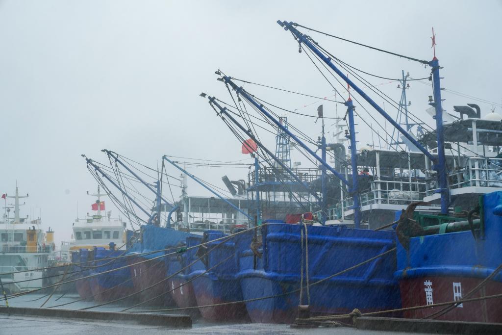 7月25日下午,在位于福建省莆田市秀嶼區(qū)埭頭鎮(zhèn)的石城國家一級漁港,今年第3號臺風“格美”的外圍風圈已經(jīng)襲來。七八級的陣風夾雜著豆大的雨點打在臉上,裹挾著三四米高的海浪拍擊著護堤,激起白茫茫一片水花。漁港里,100多艘大小船舶已在24日中午12點前回港,呈“半月環(huán)抱”狀整齊停泊,船舶間已用纜繩加固。