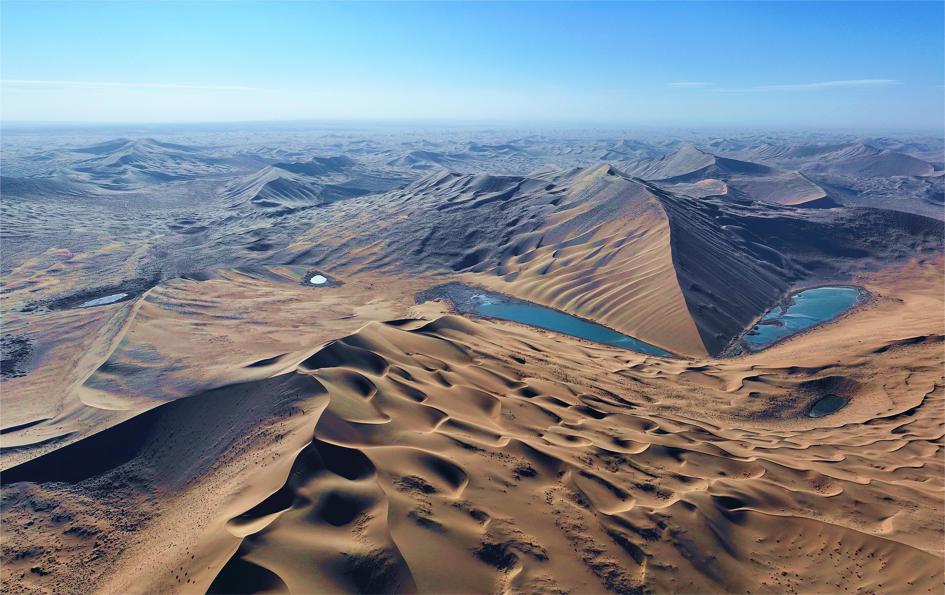 巴丹吉林沙漠地處阿拉善高原,屬中國西北極干旱的溫帶荒漠地區(qū),是中國第三大沙漠和第二大流動沙漠。該地區(qū)以連綿起伏的高大沙山和丘間眾多湖泊而聞名,展示了沙漠景觀不斷變換的地質(zhì)和地貌特征,令人嘆為觀止,全球少有沙漠可以比肩。巴丹吉林沙漠的重要標志包括世界最高的固定沙山(相對高度達 460 米)、最密集的沙漠湖泊、最廣闊的鳴沙區(qū)域,以及多樣的風蝕地貌。如此獨特的景觀展現(xiàn)了巴丹吉林沙漠非凡的自然美學價值,展示著地球上重要、典型且持續(xù)的風沙地貌發(fā)展過程,同時也是豐富多彩的生物棲息地。