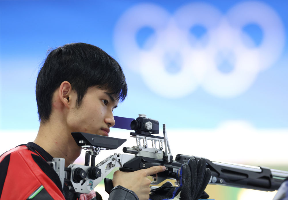 7月28日,中國選手盛李豪在男子10米氣步槍資格賽中。新華社記者 趙丁喆 攝