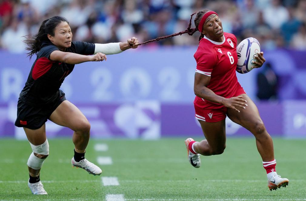 7月29日,中國隊(duì)球員劉瀟倩(左)與加拿大隊(duì)球員夏麗蒂·威廉姆斯在比賽中。當(dāng)日,在巴黎奧運(yùn)會(huì)七人制橄欖球女子分組循環(huán)賽A組比賽中,中國隊(duì)17比26不敵加拿大隊(duì)。 新華社記者 呂小煒 攝