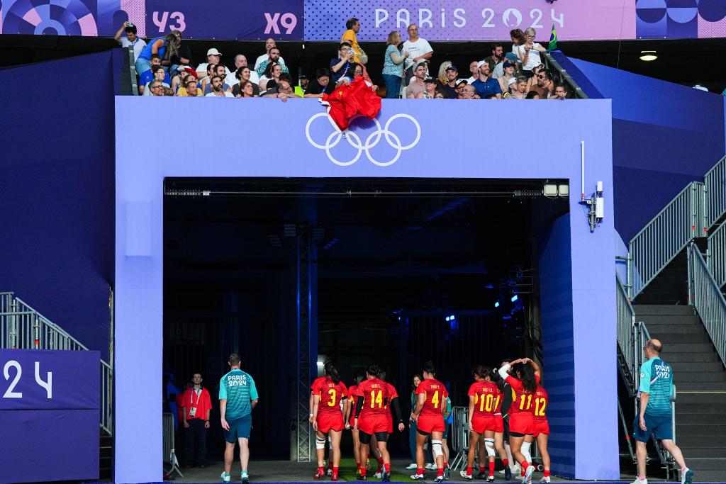 7月29日,中國隊(duì)選手劉瀟倩(右三)在賽后退場(chǎng)時(shí)向觀眾“比心”。當(dāng)日,在巴黎奧運(yùn)會(huì)七人制橄欖球女子四分之一決賽中,中國隊(duì)5比55不敵新西蘭隊(duì)。 新華社記者 許暢 攝
