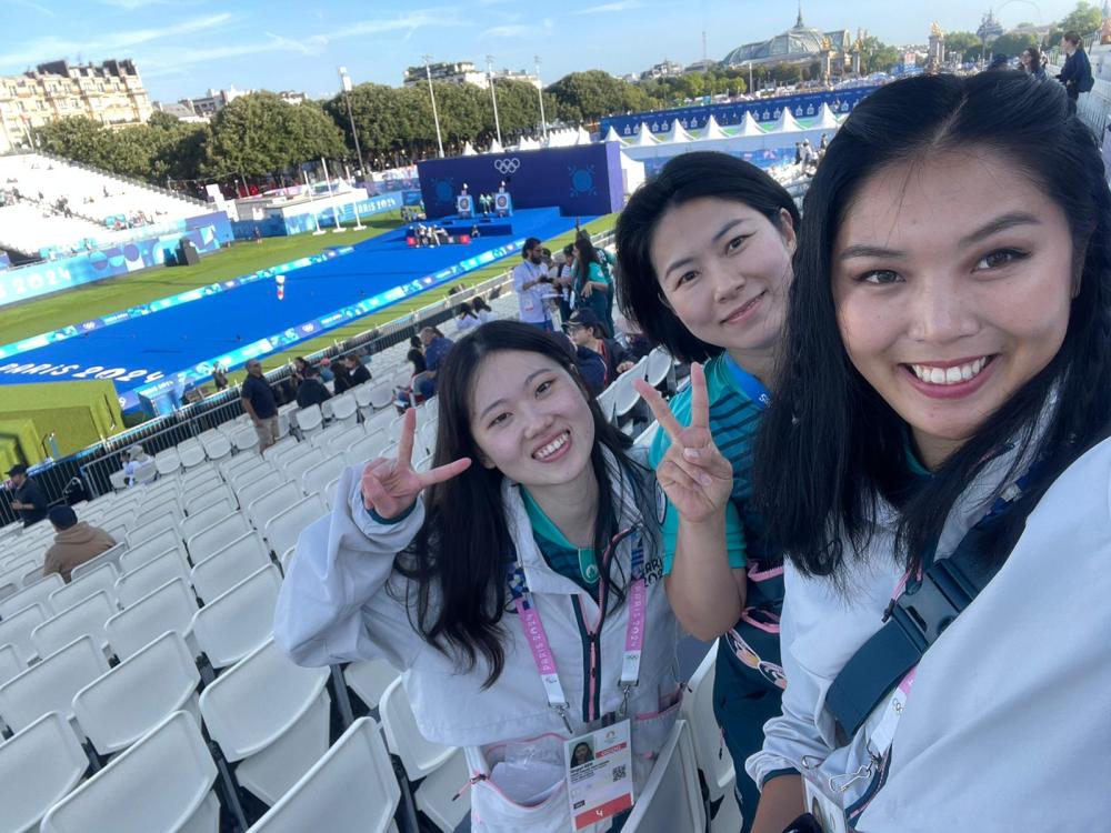 7月28日,中國(guó)志愿者任警怡(左一)和韓國(guó)志愿者(左二)、日本志愿者(右一)在巴黎奧運(yùn)會(huì)射箭項(xiàng)目場(chǎng)地。(受訪者供圖)