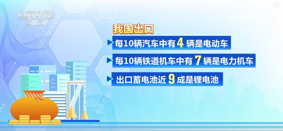 據(jù)海關(guān)統(tǒng)計(jì),我國(guó)出口的每10輛汽車中有4輛是電動(dòng)車,每10輛鐵道機(jī)車中有7輛是電力機(jī)車,出口蓄電池近九成是鋰電池,外貿(mào)出口的綠色屬性更強(qiáng)。