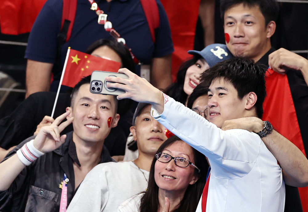 ↑中國(guó)選手潘展樂(lè)(左一)在頒獎(jiǎng)儀式后與觀眾合影。新華社記者 雒圓 攝