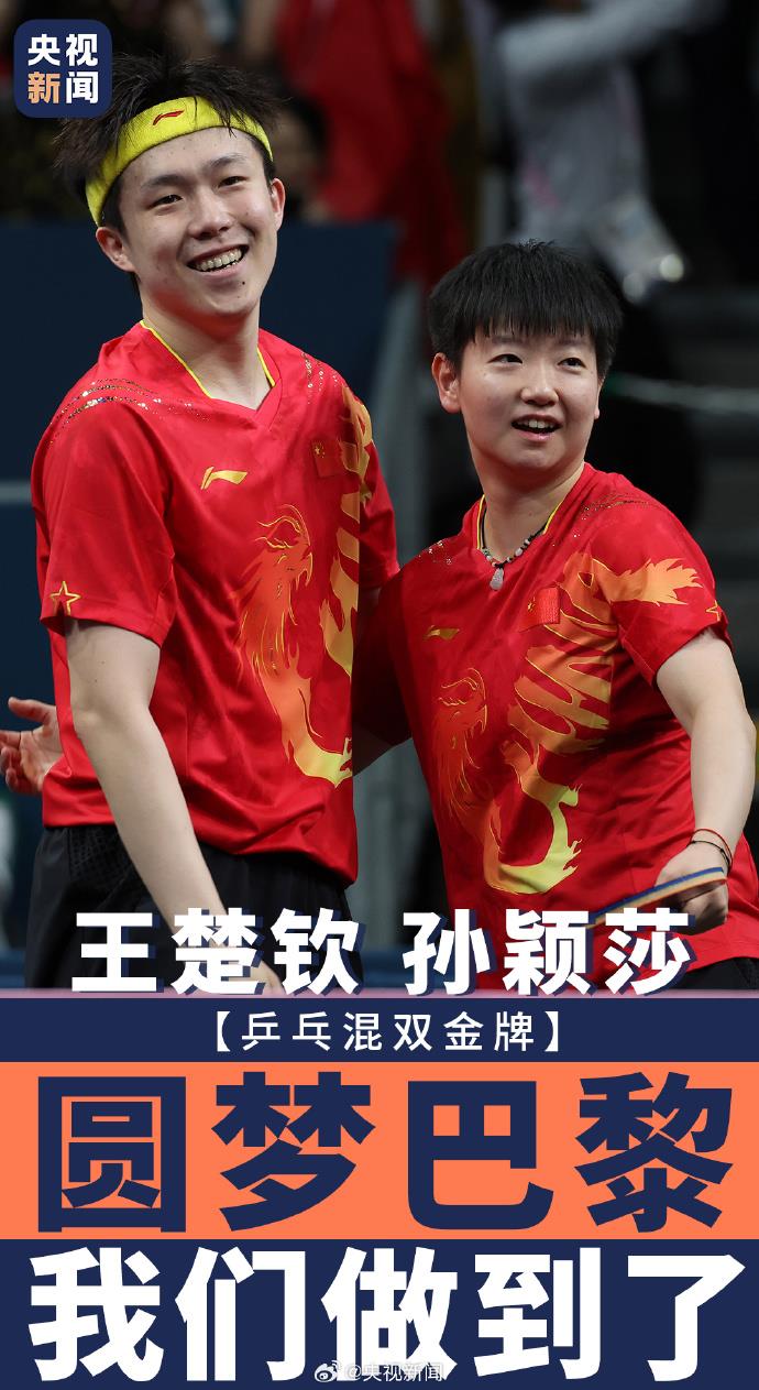 7月30日,在巴黎奧運(yùn)會(huì)乒乓球混合雙打決賽中,中國(guó)組合王楚欽/孫穎莎4-2戰(zhàn)勝朝鮮組合,奪得金牌?!拔覀冏龅搅?!”東京的遺憾在巴黎畫(huà)上了一個(gè)圓滿(mǎn)的句號(hào)!