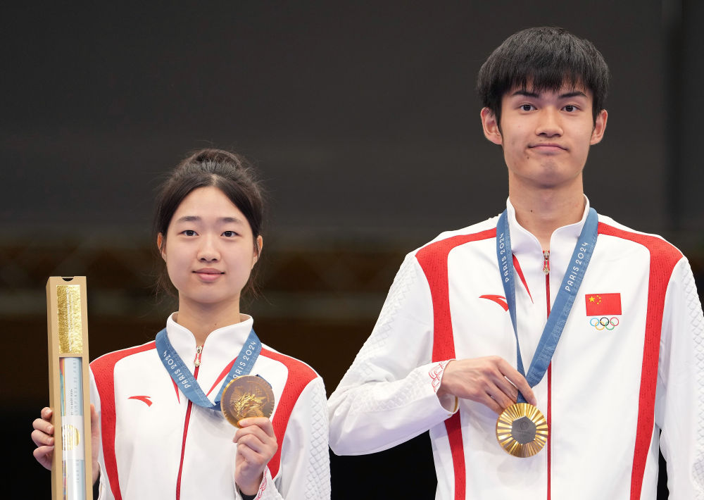 7月27日,冠軍中國選手黃雨婷(左)/盛李豪在頒獎儀式上。當(dāng)日,在法國沙托魯舉行的巴黎奧運(yùn)會射擊10米氣步槍混合團(tuán)體決賽中,中國選手黃雨婷/盛李豪奪冠,贏得巴黎奧運(yùn)會首枚金牌。新華社記者 鞠煥宗 攝