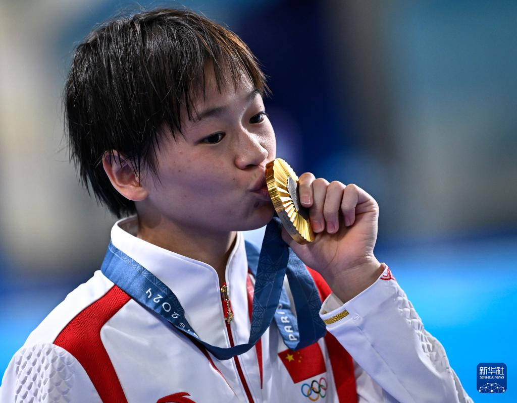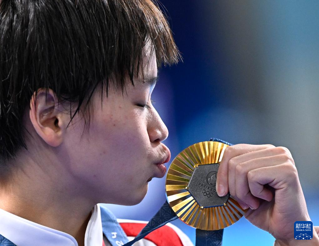 8月6日,全紅嬋親吻金牌。新華社記者 王鵬 攝