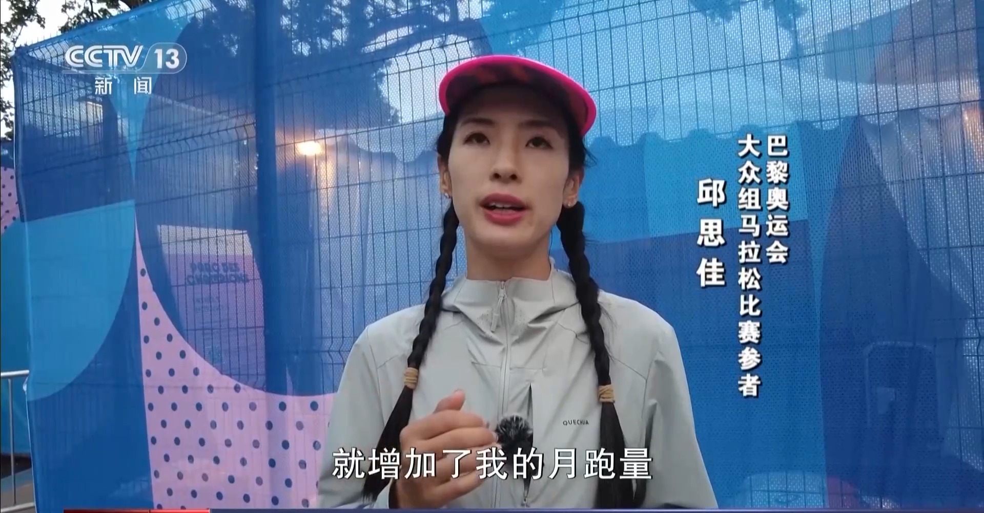 巴黎奧運會大眾組馬拉松比賽參賽者 邱思佳:我之前每個月的月跑量可能都在100公里左右,我在報名了這個比賽后,我就更加有動力,就增加了月跑量,能夠達(dá)到200公里每月。