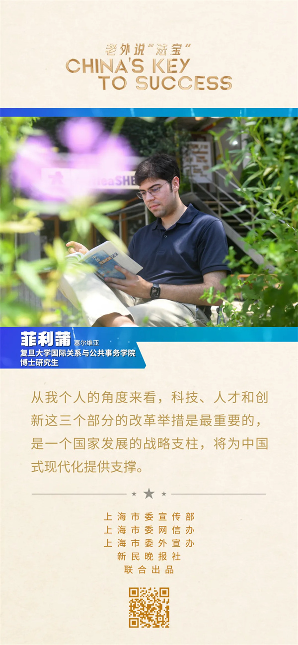 塞爾維亞帥小伙菲利蒲是復旦大學國際關(guān)系與公共事務學院博士研究生。很小的時候,他就跟隨來華從事歷史研究工作的父母來到上海,小學二年級就當上了留學生。用他的話來說,就是“接受了九年制義務教育”。