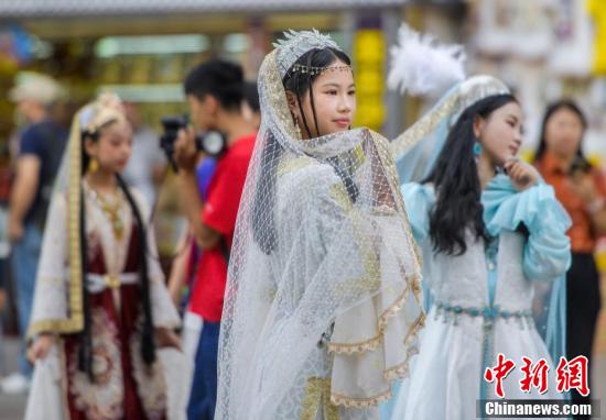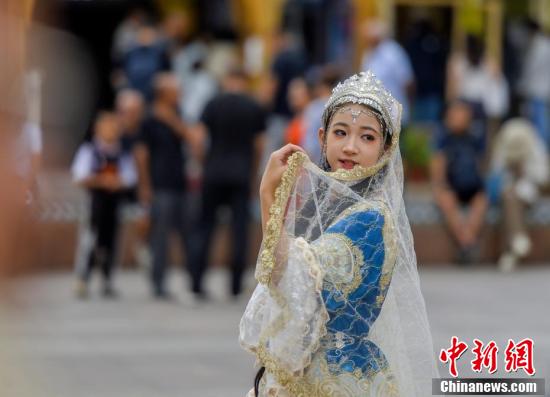 8月12日,新疆烏魯木齊市大巴扎步行街,游客穿著經(jīng)過改進(jìn)的民族服飾拍攝高清寫真照。