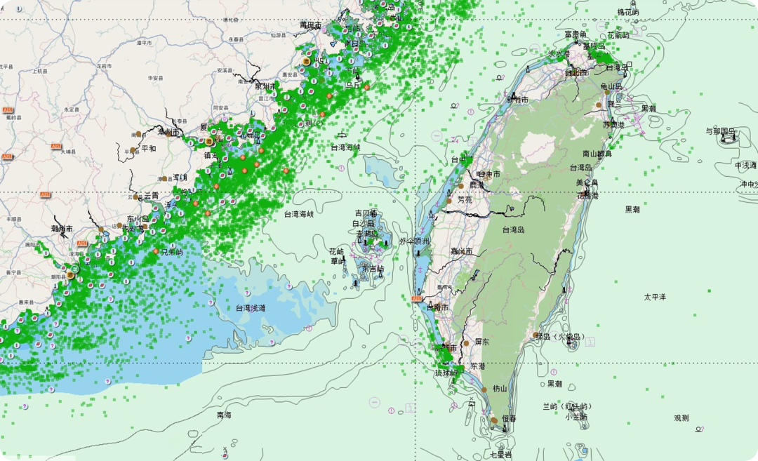 ?。_(tái)灣海峽航行船舶實(shí)時(shí)分布情況(綠點(diǎn)代表正在臺(tái)灣海峽航行的船只)