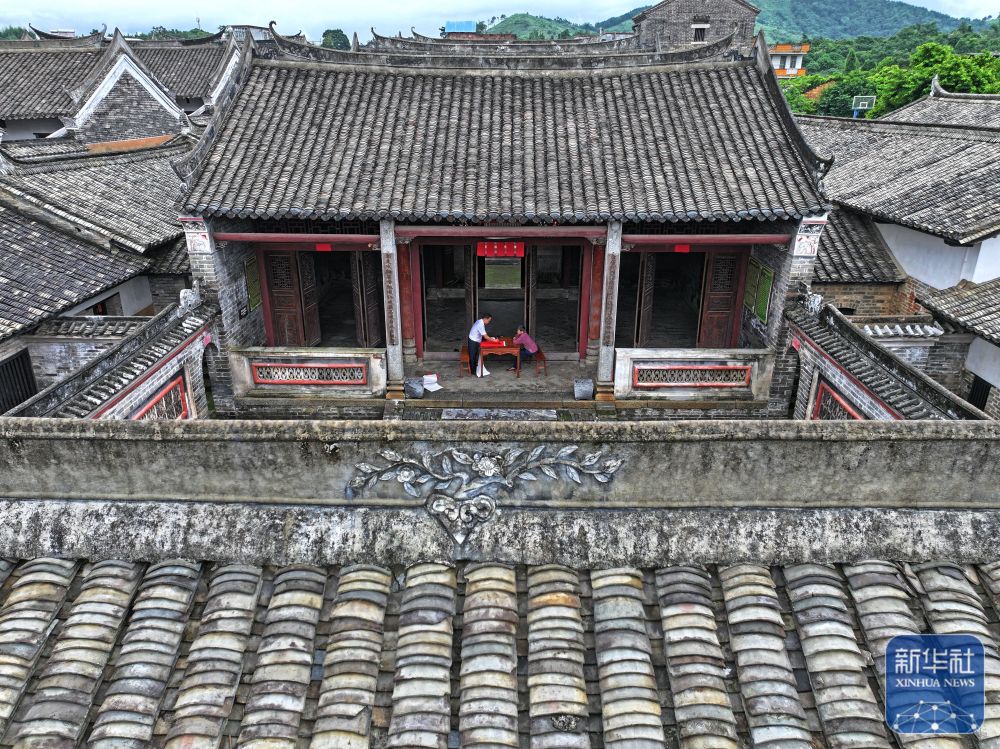 8月15日,楹聯(lián)愛好者在大蘆村古宅里寫對聯(lián)(無人機照片)。