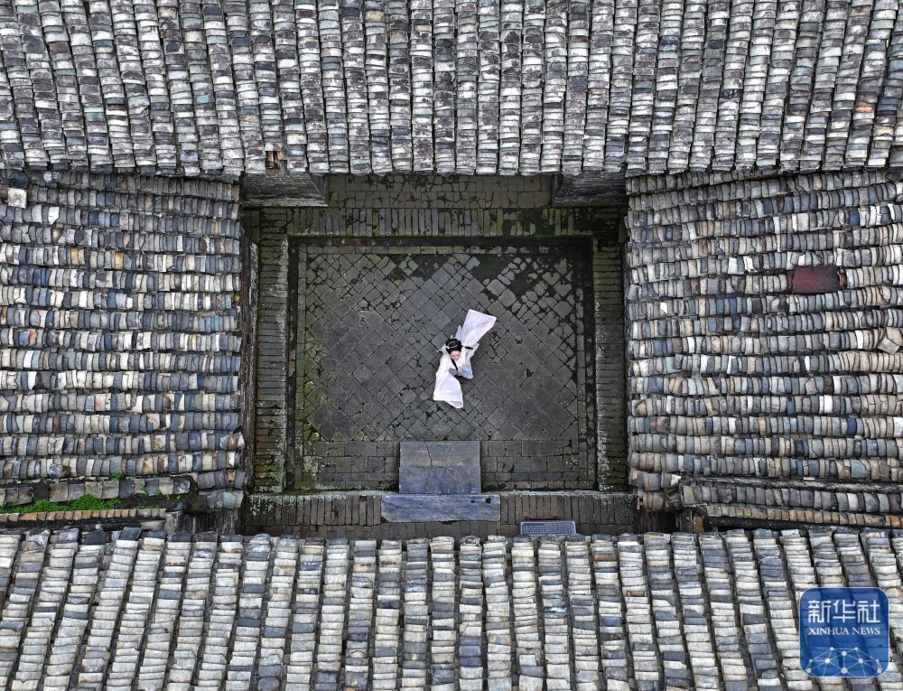 8月16日,一名身著漢服的游客在大蘆村古建筑群里跳舞(無人機照片)。