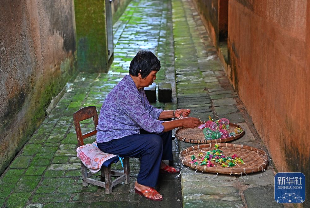8月15日,一名村民在大蘆村古宅里做手工。