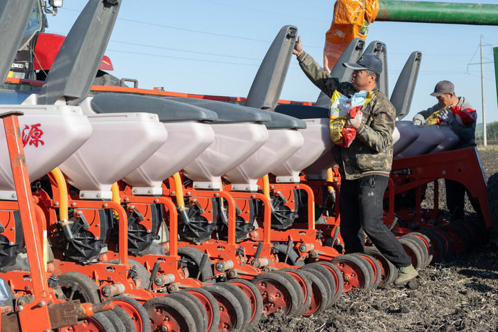農(nóng)民在黑龍江省集賢縣一片耕地里向播種機中添加大豆種子(2024年5月9日攝)。新華社記者 謝劍飛 攝
