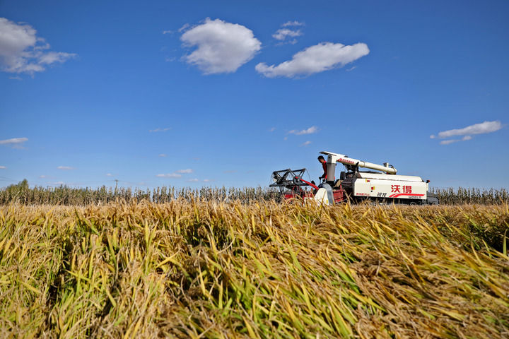 農(nóng)業(yè)機械在遼寧盤錦市遼河三角洲尤巧元家庭農(nóng)場的稻田里收割水稻(2023年10月20日攝)。新華社記者 姚劍鋒 攝