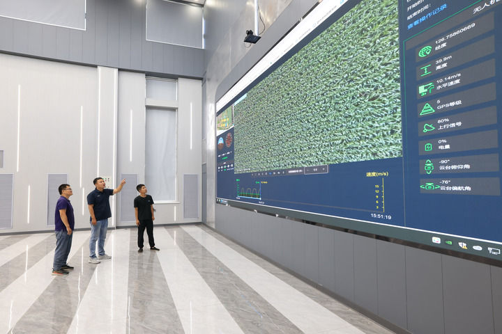 在黑龍江北大荒集團趙光農(nóng)場有限公司科技服務中心,農(nóng)業(yè)科技人員通過田間物聯(lián)網(wǎng)系統(tǒng)在數(shù)字農(nóng)業(yè)指揮大廳實時觀看智能無人機回傳的視頻,及時查看田間作物長勢情況(2024年7月22日攝)。新華社發(fā)(錢泊羽攝)