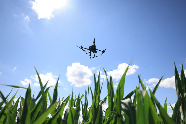在黑龍江北大荒集團趙光農(nóng)場有限公司農(nóng)業(yè)科技園區(qū),一臺智能無人機按照規(guī)定時間、規(guī)定路線進行自動巡田作業(yè)(2024年7月22日攝)。新華社發(fā)(錢泊羽攝)