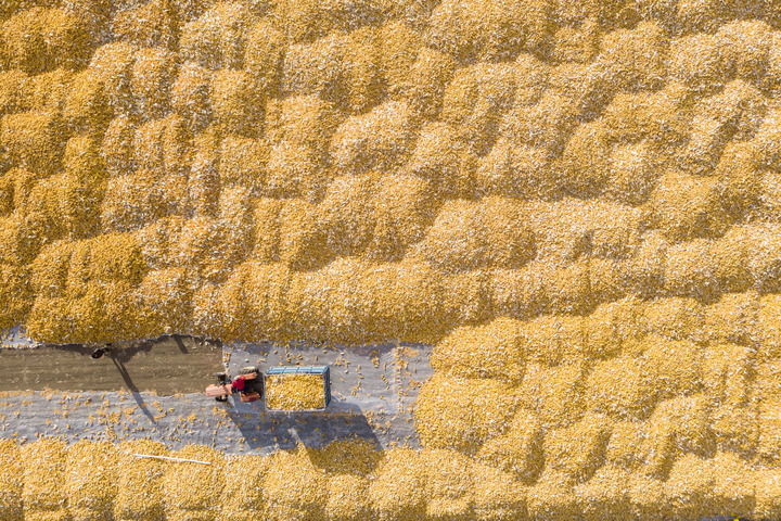 在黑龍江省肇東市五里明鎮(zhèn)東升村,農(nóng)民把收獲的玉米運到當?shù)剞r(nóng)業(yè)合作社指定的地點進行晾曬(2023年10月19日攝,無人機照片)。新華社記者 謝劍飛 攝
