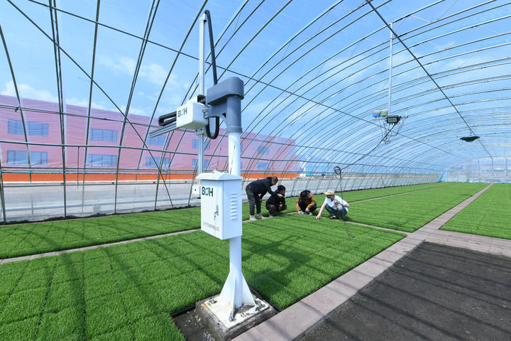 在黑龍江北大荒農(nóng)業(yè)股份有限公司友誼分公司水稻智能育秧中心的水稻育秧大棚中拍攝的智能控溫控水管理系統(tǒng)(2024年4月24日攝)。新華社記者 王松 攝