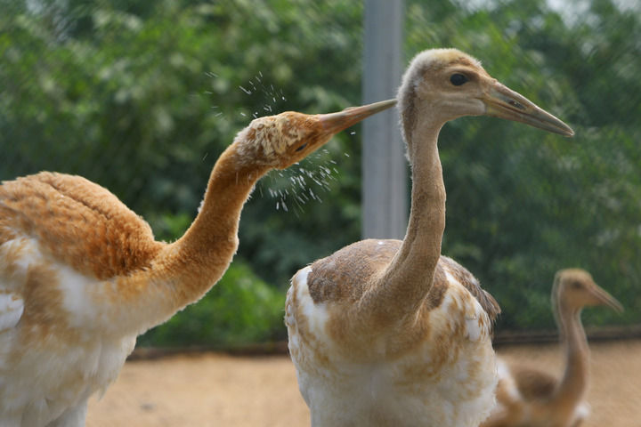 丹頂鶴雛鳥在遼寧盤錦市林業(yè)和濕地保護服務中心鶴類繁育保護站內(nèi)嬉戲(2023年8月3日攝)。新華社記者 陳為 攝