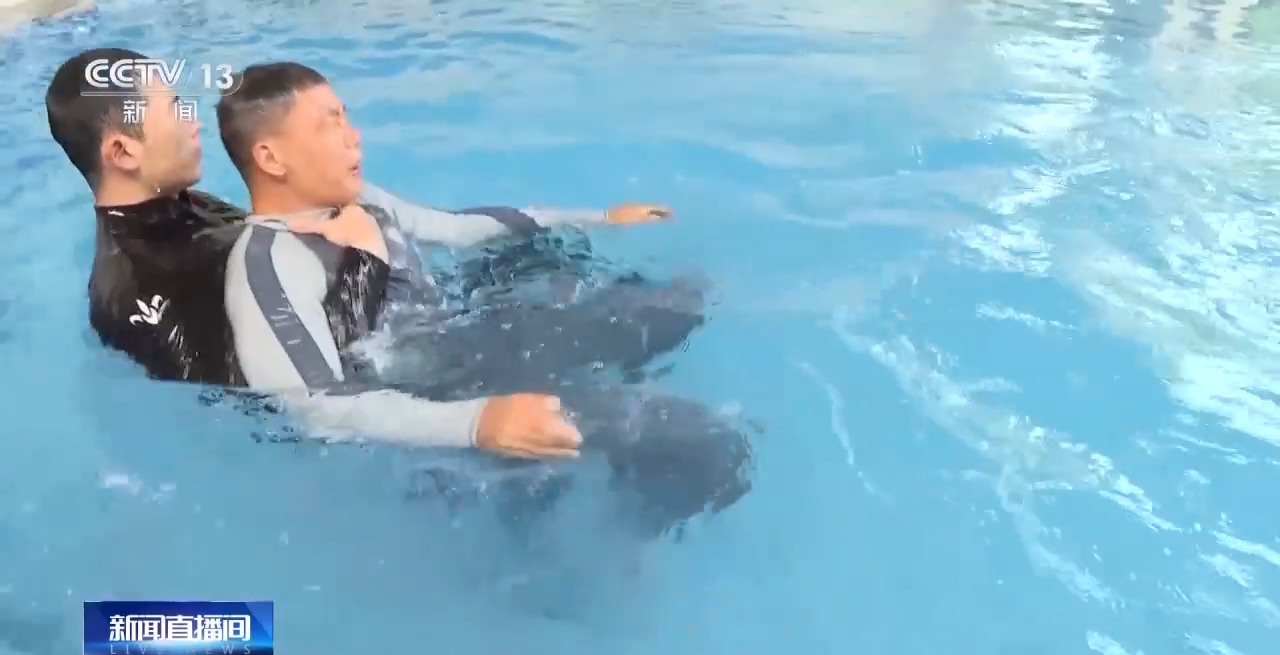 國家消防救援局水域救援訓練基地教練員 李勝龍:我們不要正面游向他,要盡量從他的背后,然后靠近他的時候要轉(zhuǎn)動他的髖部,使他背向我,因為溺水者他在慌亂的時候會抓緊我們的身體,也就是我們俗稱的“抓緊最后一根稻草”。他會死死抓住我們,影響我們的救援,所以說我們要從背后接近他,然后托住他的頭部 、頸部,使他的頭部始終露出水面,降低他的恐慌。