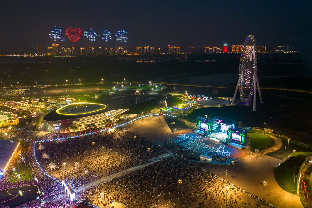人們在哈爾濱國際啤酒節(jié)現(xiàn)場觀看無人機表演。新華社記者 張濤 攝