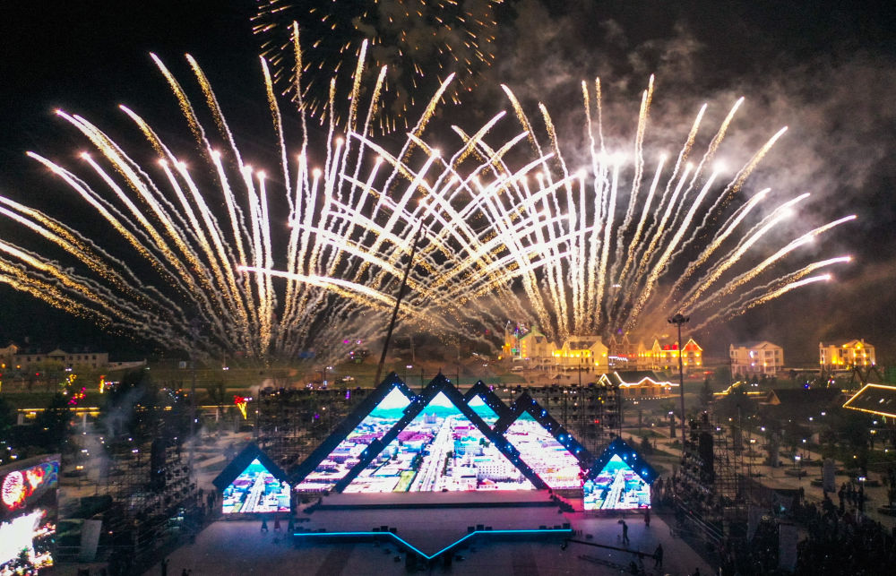 在內(nèi)蒙古興安盟阿爾山市拍攝的2023年中國(阿爾山)旅游大會開幕前一晚的焰火表演(2023年9月1日攝,無人機(jī)照片)。