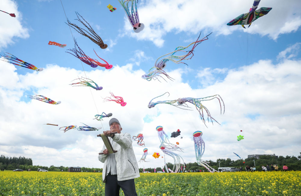 在遼寧省康平縣,一名風(fēng)箏愛好者在風(fēng)箏節(jié)活動(dòng)現(xiàn)場放風(fēng)箏(5月31日攝)。