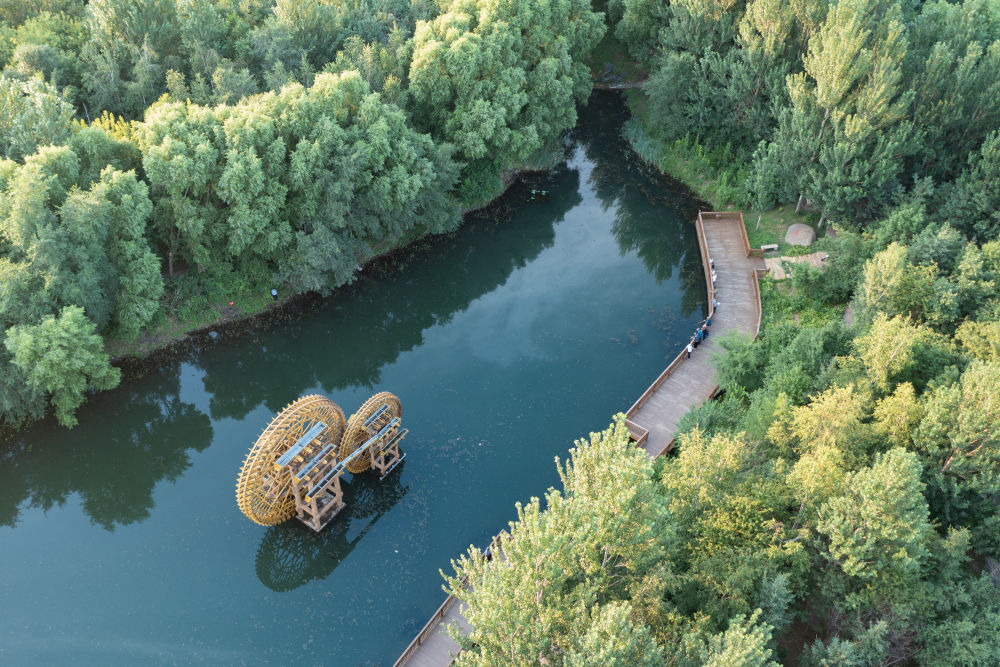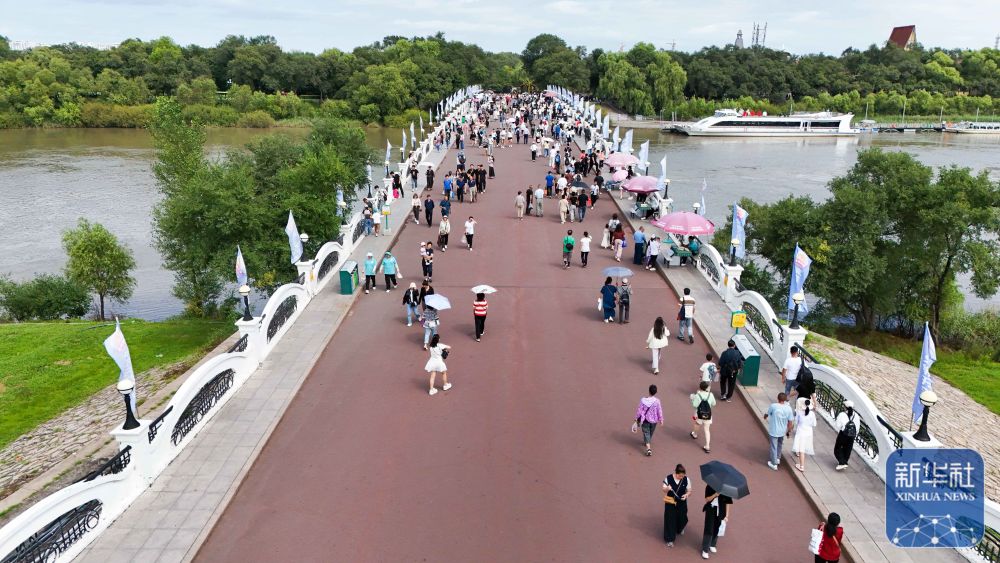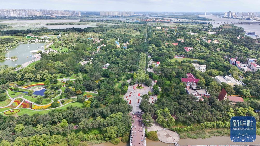 人們在龍江森工集團(tuán)綏棱林業(yè)局生態(tài)文化旅游景區(qū)一處公園游覽(7月25日攝,無人機(jī)照片)。