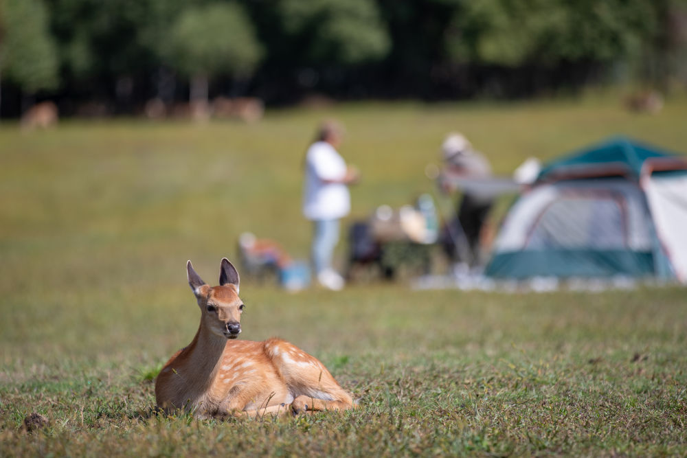 8月27日,在黑龍江伊春市上甘嶺溪水國家森林公園鹿溪牧場,一只鹿在草坪上休息。