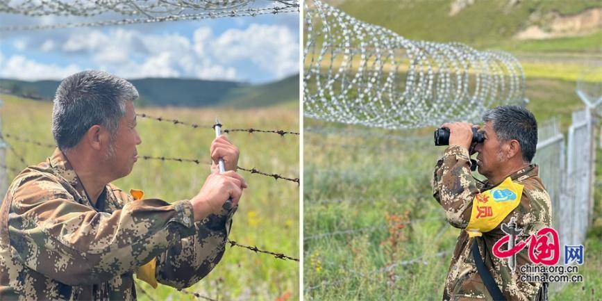 巡邊時,王玉發(fā)拿著望遠鏡眺望遠方,看到松動的鐵絲網(wǎng),用鉗子和錐子加固。中國網(wǎng)記者 吳佳潼 攝