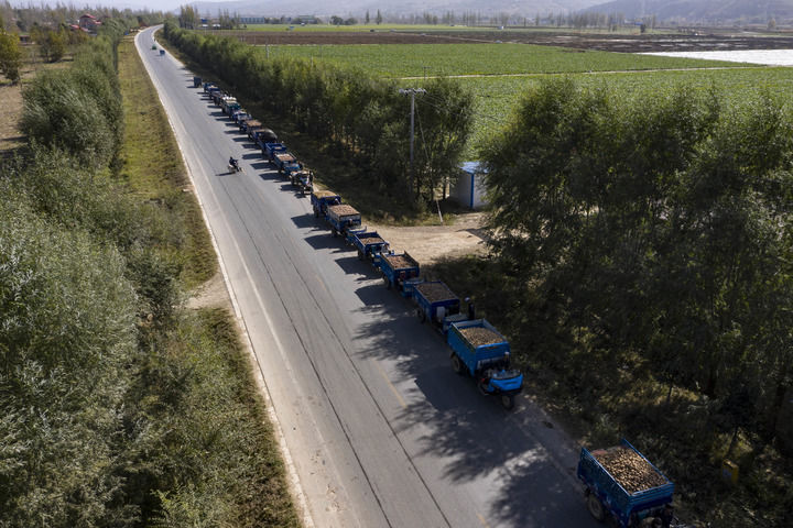 交售馬鈴薯的農(nóng)用車在寧夏固原市西吉縣馬蓮鄉(xiāng)一家淀粉廠門前排起長(zhǎng)隊(duì)(2020年10月21日攝,無(wú)人機(jī)照片)。新華社記者 王鵬 攝