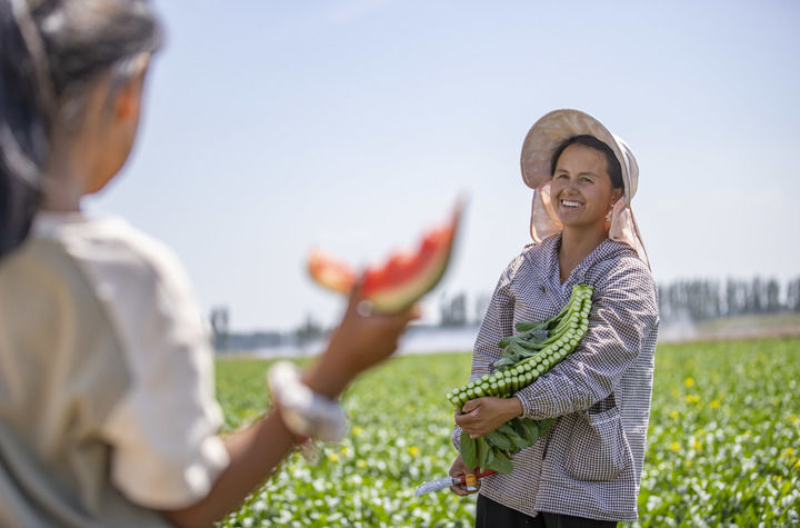 在寧夏青銅峽市瞿靖鎮(zhèn)毛橋村蔬菜基地,來(lái)自貴州的苗族務(wù)工人員楊文高(右)在采收間隙和女兒聊天(2024年8月23日攝)。新華社記者 楊植森 攝