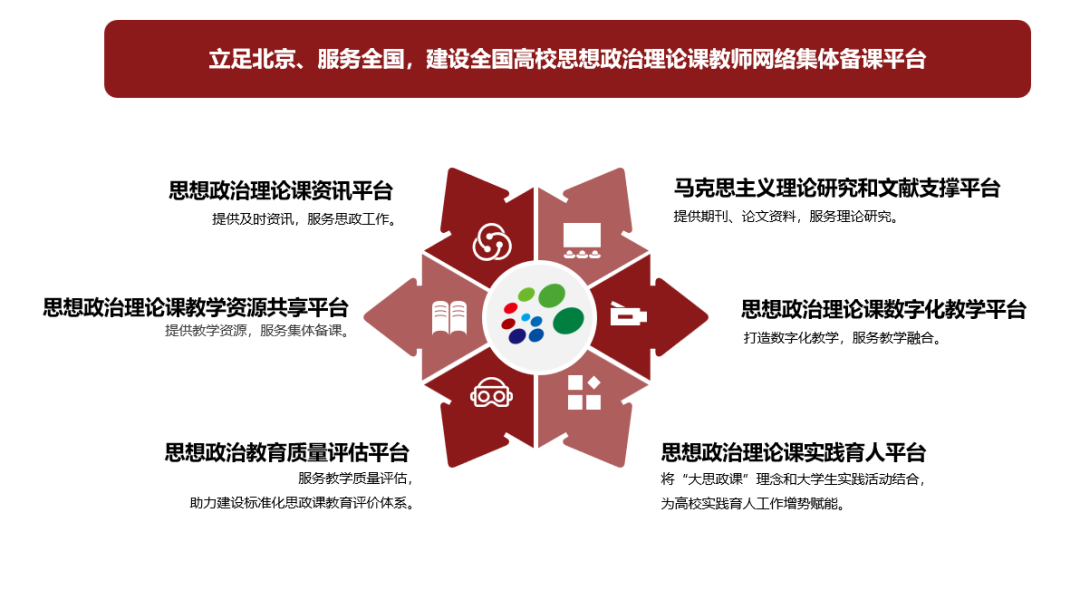 2019年的學(xué)校思想政治理論課教師座談會上,習(xí)近平總書記在談到各地各高校尤其是北京市的有益探索時,專門提到了“北京高校思想政治理論課高精尖創(chuàng)新中心”。自2015年中心成立,中國人民大學(xué)全面建設(shè)面向大中小學(xué)思政課教師的一體化網(wǎng)絡(luò)資源平臺,打造服務(wù)全國大中小學(xué)思政課教師的“中央廚房”。