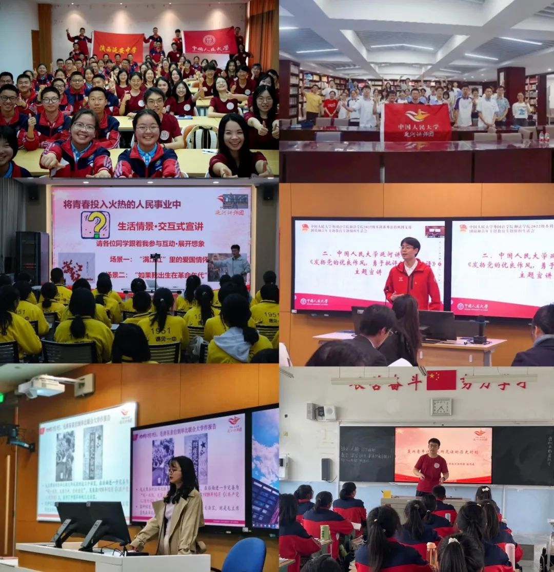 2021年7月,中國人民大學(xué)組建延河講師團(tuán),打造一支大中小學(xué)思政教育一體化的青年宣講“輕騎兵”,以青年聲音宣傳黨的奮斗歷程和偉大成就、光榮傳統(tǒng)和優(yōu)良作風(fēng)、實(shí)踐創(chuàng)造和理論創(chuàng)新,講好“黨旗下的思政課”?,F(xiàn)已推出7個專題、116門精品課程,以革命老區(qū)、脫貧摘帽地區(qū)、民族邊疆地區(qū)中小學(xué)校為重點(diǎn),開展宣講活動600余場,覆蓋超過170萬人次、3000所學(xué)校。