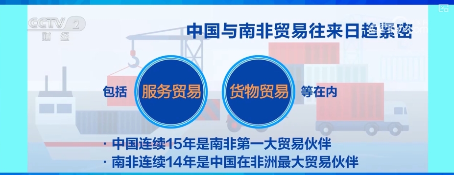 據(jù)統(tǒng)計(jì),包括服務(wù)貿(mào)易、貨物貿(mào)易等在內(nèi),中國連續(xù)15年是南非第一大貿(mào)易伙伴,而南非則連續(xù)14年是中國在非洲最大貿(mào)易伙伴。2024年前5個(gè)月,雙邊貿(mào)易額達(dá)235億美元。其中,南非對華出口153億美元,同比增長近14%。